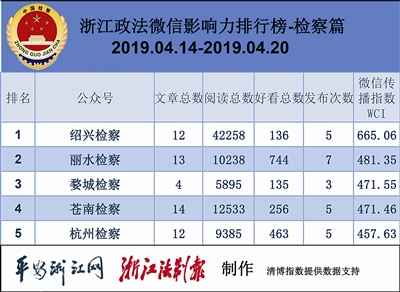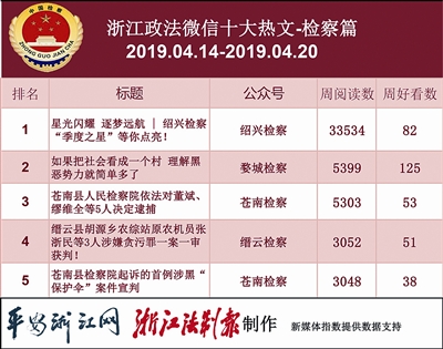 本期检察院榜,“绍兴检察”夺魁,阅读总数远超排名第二的“丽水检察”。热文榜夺魁文章《星光闪耀逐梦远航 | 绍兴检察“季度之星”等你点亮!》也是出自“绍兴检察”,看来投票评比活动还是很受欢迎的。