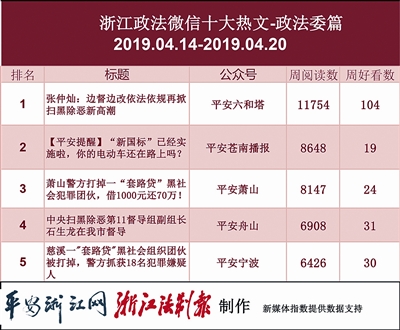 “平安六和塔”成为本期政法委排行榜和热文榜的双料冠军。其中热文《张仲灿:边督边改依法依规再掀扫黑除恶新高潮》收获阅读量11754,领跑榜单,看来扫黑除恶果然是大家关注的话题。