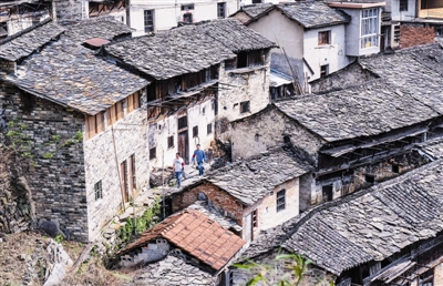 图为4月23日,由岛石镇年轻党员组成的“乡村文化保护队”队员在巡查株川自然村的石板屋和石板路。新华社 徐昱 摄