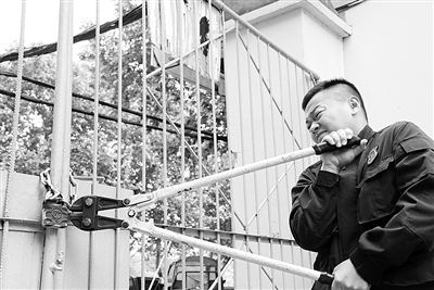 | 消防员剪断消防通道铁门锁链 |