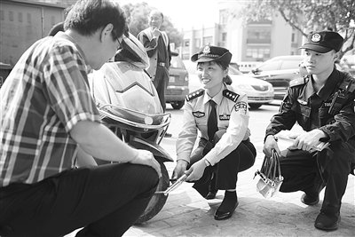 为防止电动车被盗,近日,平湖市公安局新仓派出所推出“警民提醒锁”,为忘拔钥匙的电动车上锁,提醒车主及时拔锁,有效减少了辖区电动车被盗量。图为5月9日,民警提醒忘拔钥匙的电动车主及时上锁。