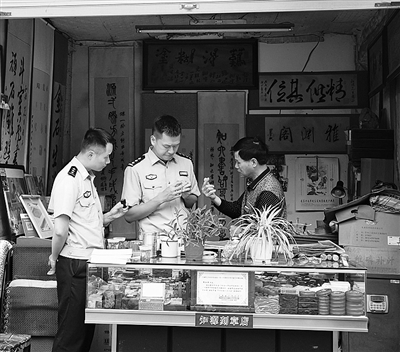 近日,丽水市公安局治安支队民警深入基层开展“三服务”活动,对全市74家印章店家进行业务指导与上门服务。图为民警在松阳县西屏镇某刻章店走访。