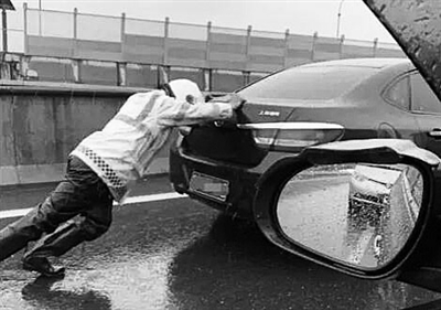 “当时以为只是雨大,后来慢慢挪过去才发现是有辆车抛锚动不了了”。想着碰到这样的事也没办法,陈女士只能随着车流慢慢往前挪,就在她快要经过这辆抛锚车时,看到一名骑警正冒着大雨,在后面使劲推车,整个人几乎和地面齐平。
