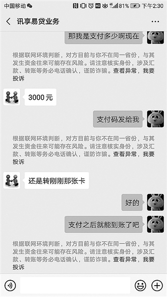 这时,微信平台认为其交易存在风险,直接中止了小郭的操作。小郭为了拿到贷款,又从自己的手机银行上为客服转账了3000元。