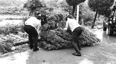 本报讯 5月15日下午,东阳市雷雨交加,下午4点左右,南马派出所民警徐宏辉带领两名实习队员冒着大雨,巡逻至南马镇水口村路段时,发现路边6颗大树被狂风连根掀翻,横在道路上,占据了整个路面。
