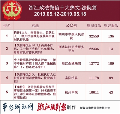 本期法院榜单,对于失信被执行人的关注依然热度不减。纵观之前的4期榜单,“湖州市中级人民法院”都没能进前五。这一期,它凭借《拘传114人,拘留56人,罚款51人|湖州法院掀起凌晨集中强制执行风暴》一文成为“双料冠军”。此文的阅读量高达32559,在看数为136,全都高于法院榜其他美文,使得“湖州市中级人民法院”这个“双料冠军”实至名归。