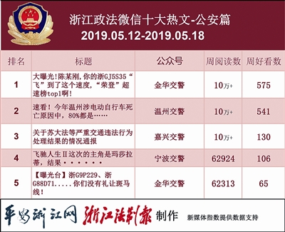 本期公安榜单,前三名依次是:“金华交警”“温州交警”“浙江衢州公安”。其中,冠军“金华交警”的《大曝光!陈某刚,你的浙GJ5S35“飞”到了这个速度,“荣登”超速榜top1啊!》一文,也位居热文榜榜首。此文直接曝光车牌号,以幽默讽刺的方式告诫市民“切莫超速、安全出行”,获得“10万+”阅读量。