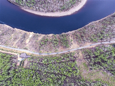 5月21日,夏季驻防的车队行驶在林区道路上(无人机航拍)。