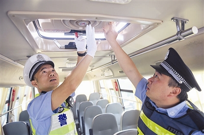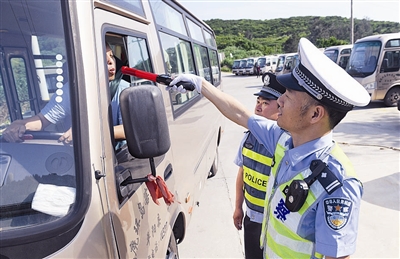 即便如此,交通指挥和巡查依然少不了,尤其在旅游旺季的时候。郑山荣和戴海剑分别登上中巴车,检查车辆是否存在超载,并提醒游客系好安全带。在车站,他们加强了车辆的安全检查,确保每辆中巴车的灭火器、安全带、逃生门都没有问题,并依次对驶出车站的中巴驾驶员进行酒精测试。