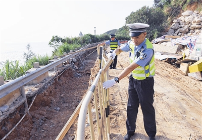 在完成一系列的程序处理后,他们又赶往沿海公路的某处施工点,在确认警示牌、护栏等安全设施设置到位后,郑山荣提醒现场的施工负责人务必在周五旅游高峰到来前将道路恢复原状。