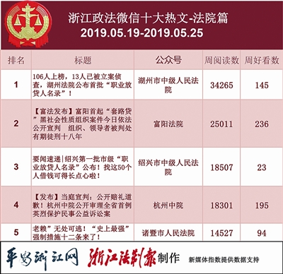 法院榜竞争激烈,本次榜首花落“富阳法院”。热文榜中,“湖州市中级人民法院”凭借《106人上榜,13人已被立案侦查,湖州法院公布首批“职业放贷人名录”!》拿下第一,文章给“职业放贷人”敲响了警钟。