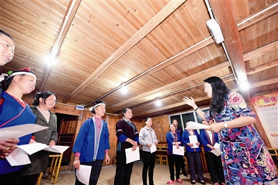 在广西柳州市三江侗族自治县良口乡燕茶村村部,吴纯娟利用晚上时间与村民排练侗族大歌。吴纯娟是柳州三江侗族自治县文化馆的文艺辅导员。今年3月,她来到三江县良口乡燕茶村,成为一名驻村工作队队员,侗族大歌是她工作的一件“法宝”。