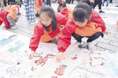 29日,杭州馒头山社区举行“蝶变馒头山”活动。环境越来越好、志愿者热情服务……当地居民在百米长卷上,画下自己眼中的社区变化,“讲述”心中的馒头山故事。张孙超 汪琳 沈忱 摄