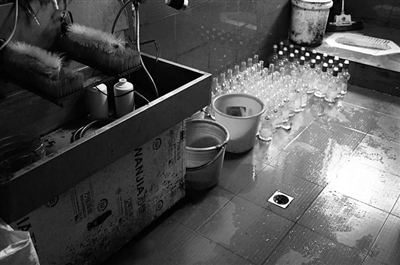 民警冲击捣毁制假窝点时发现,与灌制的高档“茅台”“五粮液”等白酒形成鲜明对比的是,生产假酒的环境极为恶劣,整个勾兑过程是在出租房的厕所里完成的。