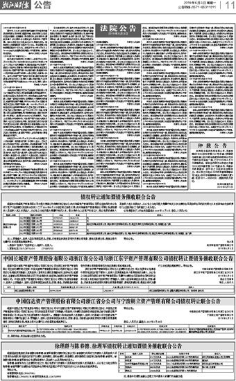 中国信达资产管理股份有限公司浙江省分公司与宁波朝立资产管理有限公司债权转让联合公告