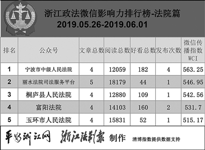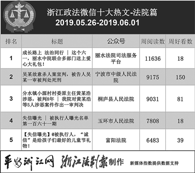 本期法院榜“大换血”,排名前三的分别是“宁波市中级人民法院”“丽水法院司法服务平台”和“桐庐县人民法院”。“丽水法院司法服务平台”成为热文榜上的“黑马”,该公众号的《成长路上 法治同行|这个六一,丽水中院联合多部门送上爱心大礼包!》一文收获阅读数11636,成为热文榜冠军。丽水市中级法院趁着“六一”儿童节为青少年送上普法大礼包,在重要节日里应景地推出一些形式新颖的活动,还是很受欢迎的。