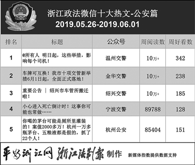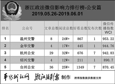 在前三期公安榜上,“温州交警”一直位列第二,本期终于打败老对手“金华交警”冲上冠军宝座。热文榜的前三甲分别是“温州交警”“金华交警”“绍兴交警”,全都获得了“10万+”的阅读量,而且文章都是有关交通出行的新举措、新公告等。可见,与人们切身利益相关的内容更容易吸引眼球。