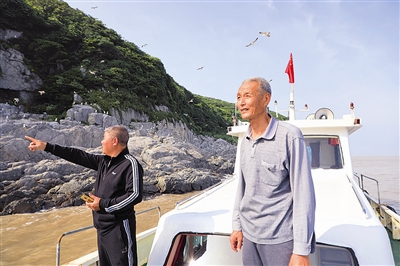 | 陈良昆(右)和吴遵岳绕着鸟岛巡逻 |