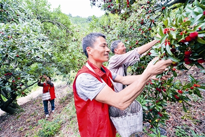 6月17日,长兴县龙山街道渚山村杨梅产业帮扶基地里,党员志愿者帮助帮扶对象采摘杨梅。龙山街道结合社户对接、乡贤认购、包揽销售等方式精准帮扶21户低收入农户,实现助农增收。