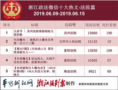 本期法院榜,“富阳法院”蝉联影响力榜冠军,热文榜榜首则是来自“吴兴法院”的《父亲节 | 吴兴法院萌娃唱给父亲的歌》一文,文章以父亲节为契机,录下了孩子唱给父亲的歌,不少读者被“萌”化了。