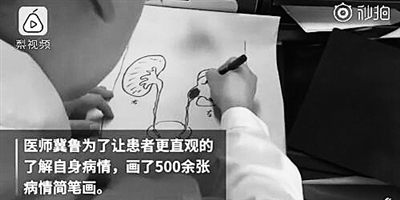 江苏淮安市第一人民医院泌尿外科主治医师冀鲁,为了让患者更直观了解自身病情,画了500余张病情简笔画,向患者介绍病情。冀鲁表示多点耐心给患者,会有更好的医患沟通。