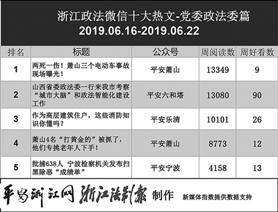 本期政法委榜单,前三名依次为“平安萧山”“平安六和塔”“平安乐清”。“平安萧山”的《两死一伤!萧山三个电动车事故现场曝光!》一文获得最多关注。文章通过3个案例,告诫电动车驾驶员骑车一定要佩戴安全帽,注意出行安全。