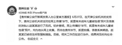 6月27日凌晨,在天津警方的支持下,贵州警方找到了发帖人赵某,并依法对其进行了询问并带至毕节。据毕节市公安局副局长付凌介绍,从初步掌握的情况看,2015年赵某加入了一个QQ群,群里有时会传播一些淫秽图片。赵某进行了搜集,于今年1月至5月陆续通过微博私信发给所谓的网友,“为了增加可信度,于是捏造自己干过这些事,到过贵州”。