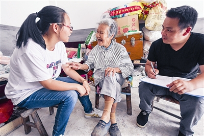 6月27日,湖州市织里镇义皋村的党员志愿者在了解88岁的困难村民吴福仙(中)的生活需求,准备帮她完成“微心愿”。 “七一”前夕,织里镇开展“点亮微心愿,实现微梦想”主题活动,基层党员集中认领乡镇困难群众的“微心愿”,帮助他们解决实际困难。