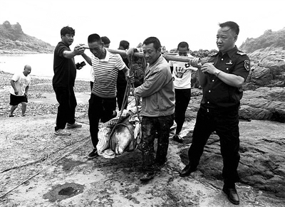 6月27日上午,在玉环市坎门街道黄门村外辽海边,当地村民在海滩上发现了一只搁浅的海豚,发现时海豚已经死亡。据目测,这只海豚体长约2米,体重逾150公斤。村民立即联系当地渔政部门,渔政部门随后将海豚运送至一家冷库,等候进一步处理。据当地一些上了年纪的老渔民说,他们还是第一次看到海豚搁浅。至于海豚为何会搁浅,还有待专家分析考证。