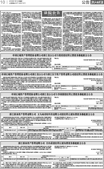 中国长城资产管理股份有限公司浙江省分公司与浙江东宇资产管理有限公司债权转让暨债务催收联合公告