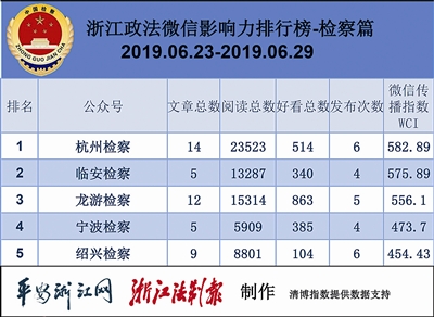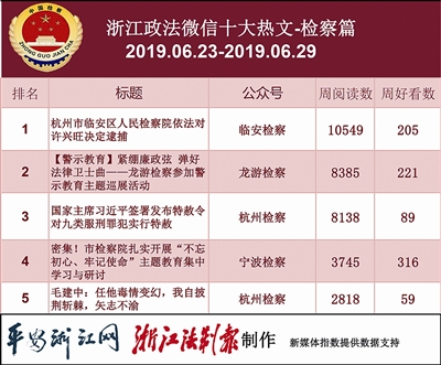 本期检察院榜单上,“杭州检察”再次夺魁。热文榜上,“临安检察”的《杭州市临安区人民检察院依法对许兴旺决定逮捕》阅读数过万,此文及时发布权威信息,很受关注。