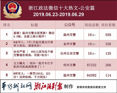 本期公安榜单,“温州交警”“金华交警”“绍兴交警”分别名列前三名。热文榜上,3篇阅读量达“10万+”的文章,全都与交通安全有关。其中,“温州交警”的《重磅!温州交警全面更新!微信4.0版,全新上线小程序!》一文获得冠军,并获得559个在看数。通过微信服务号就能在线办理各类交管业务,真心方便,难怪老百姓都要点进来看。