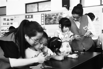 7月8日,志愿者们给林城镇周吴岕村的孩子们上剪纸课。