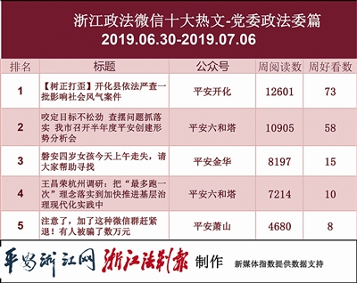 本期政法委榜,“平安开化”首次上榜,且一举夺魁。其《【树正打歪】开化县依法严查一批影响社会风气案件》一文获得1.2万阅读量,此文梳理了一批开化县“三堵”“四闹”“五乱”影响社会风气案件,如此有利于百姓生活稳定和谐的好文,大家自然“在看”。