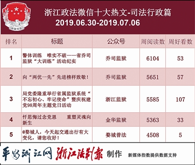 本期司法行政榜,“乔司监狱”表现突出,不仅拿下两榜第一,还好文频出。其《警体训练 唯实不破——省乔司监狱“大训练”活动纪实》和《向“两优一先”先进榜样致敬!》两篇文章在热文榜分列第一第二,文章语言精简,排版优美,值得各位小编学习。