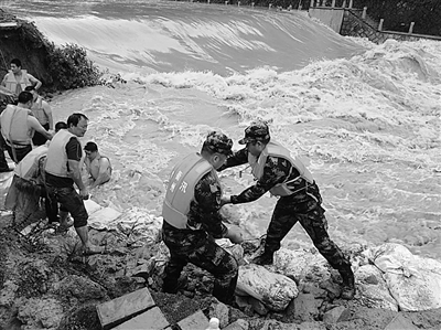 连日来,强降雨导致龙游县社阳乡社阳溪水位持续上涨,超过警戒线1米。9日下午3点左右,位于社阳乡卫生院东侧300米处的堤坝被水流冲出一段长达8米左右的缺口。下午3点10分,龙游县应急管理局向武警衢州支队请求支援,该支队第一时间出动40名兵力参与救援。下午3点50分,武警衢州支队救援人员到达社阳乡会同当地民兵投入抢险。现场江水流速湍急,稍有不慎,救援人员极有可能被卷入江中。但官兵们毫不畏惧,有序分工,一部分人负责装运沙袋,一部分人身系安全绳在缺口处负责填堵。截至9日下午6点10分,缺口已填补三分之一,水位下降了60公分。通讯员 陈杰 余一成 张鹏