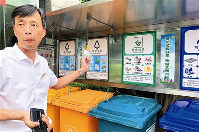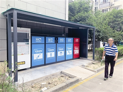 像是绝大多数小区的缩影,水月苑把垃圾分类的突破口放在宣传引导上。这一点,从门口LED屏幕上滚动播报的宣传视频以及醒目的分类宣传横幅中不难看出。同时,从今年6月下旬开始,小区还组建了志愿者团队,早晚在垃圾桶周围义务轮流站岗,劝导、督促、指导居民进行正确的分类投放。至于时下最流行的智能垃圾分类回收设备,也早已“安排”上了。