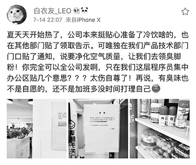 近日,北京一互联网公司发放夏日福利,特地在程序员集中办公的楼层发臭脚粉,并让其注意卫生。对此,程序员陈某认为公司没在其他楼层发放,只发给他们,太针对程序员群体,有点伤自尊。而该公司行政表示没有恶意,这层确实味道比较大。对此,你怎么看?