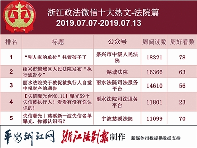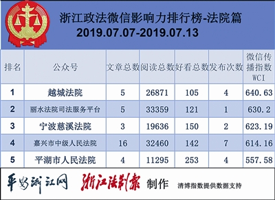 “越城法院”夺魁!热文榜上,“嘉兴市中级人民法院”的《“别人家的单位”托管孩子了》一文排名第一,孩子问题关乎千万家庭,不受关注都难。“越城法院”的《绍兴市越城区人民法院发布“执行通告令”》一文稍逊一筹,排名第二。