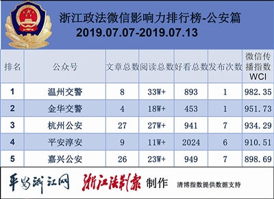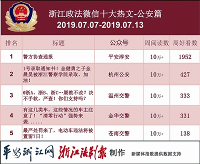 本期公安榜单,前三名依次为“温州交警”“金华交警”“杭州公安”,但热文榜榜首文章却来自“平安淳安”。7月10日,“平安淳安”发布《警方协查通报》一文,通报了警方协助调查淳安失踪女童案情况,获得较高关注。淳安失踪女童案牵动着全国人民的心,暑假到了,希望各位家长也给予少年儿童更多关注。