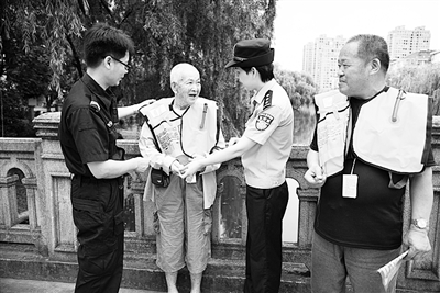 近日,平湖市公安局民警走进辖区,为群众宣传防溺水安全知识,告诫群众不得私自到河塘中洗澡、游泳。图为7月16日,民警现场教群众如何正确使用救生器材。
