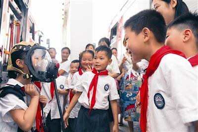 7月17日,小学生在体验消防救援装备。