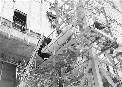 11时32分,消防救援人员赶到现场,发现在塔吊约5米高处有3人被困,其中2人受伤无法移动。指挥员立即命令一组消防人员进行现场保护,另一组消防员利用9米拉梯和多功能担架登上塔吊实施救援。