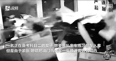 女子练倒库,错把油门当刹车 撞穿办公室