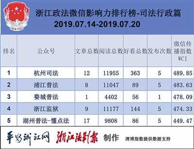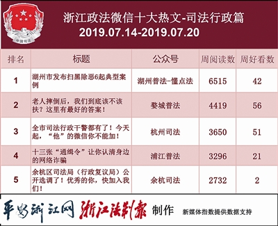 本期司法行政榜大换血,“杭州司法”“浦江普法”和“婺城普法”分别获得影响力榜前三甲。其中,“浦江普法”有3篇文章都进入了热文榜十强。而热文榜的冠军由“湖州普法-懂点法”的热文《湖州市发布扫黑除恶6起典型案例》拿下。扫黑除恶,人人关心,典型案例尤其吸睛。