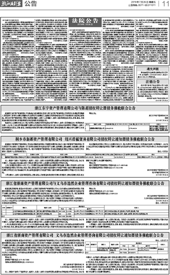 浙江省浙商资产管理有限公司 义乌市浩然企业管理咨询有限公司债权转让通知暨债务催收联合公告