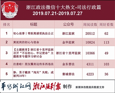 本期司法行政榜上, “浙江监狱”再次蝉联第一,其热文《初心故事丨零距离感受执法公正》获得最高阅读数。“浙江省十里坪监狱”“金华监狱”的“初心故事”也获得较高关注,重温入党记忆,用深情讲述“初心故事”,鼓励党员砥砺前行,正能量满满。