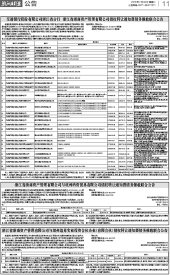 交通银行股份有限公司浙江省分行 浙江省浙商资产管理有限公司债权转让通知暨债务催收联合公告
