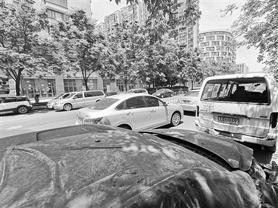 本报讯 对杭州市下城区费家塘路周边的居民来说,20多辆霸占着路面免费停车位的“僵尸车”就是他们的“眼中钉”,有些甚至停放了一年以上,令居民们深恶痛绝。记者昨天在现场看到,费家塘路上共有67个免费停车位,白天大多私家车都开走了,放眼望去大部分竟都是“僵尸车”。其中车牌为浙A0D359的白色面包车被厚厚一层灰盖住,后车窗被砸破,车厢成了垃圾箱,堆着一地的空饮料瓶、纸板箱、废纸等;紧跟其后的一辆黑色轿车也是“僵尸车”,车头装损严重,轮胎也瘪了。