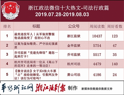 本期司法行政榜,“浙江监狱”蝉联冠军,“杭州司法”“金华监狱”紧随其后。“浙江监狱”的《最美退役军人丨从军装到警服 他说战场变了 但初心不改》在建军节之际讲述了退役军人李志成的初心与坚守,阅读量遥遥领先。